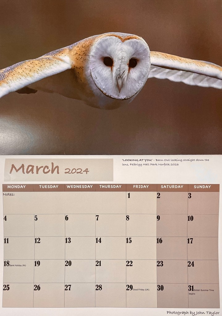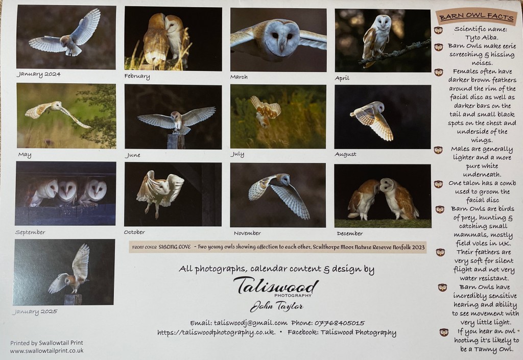 John and I are both passionate about Owls, especially Barn Owls, whose numbers are not rising in Norfolk at the rate other parts of the country are. So we are trying to do something about that, will you support us and buy a calendar? Pop over to our shop https://taliswoodphotography.co.uk/shop-2023/