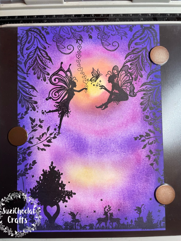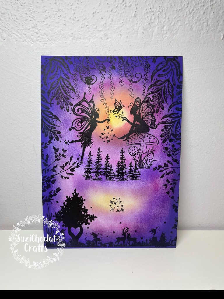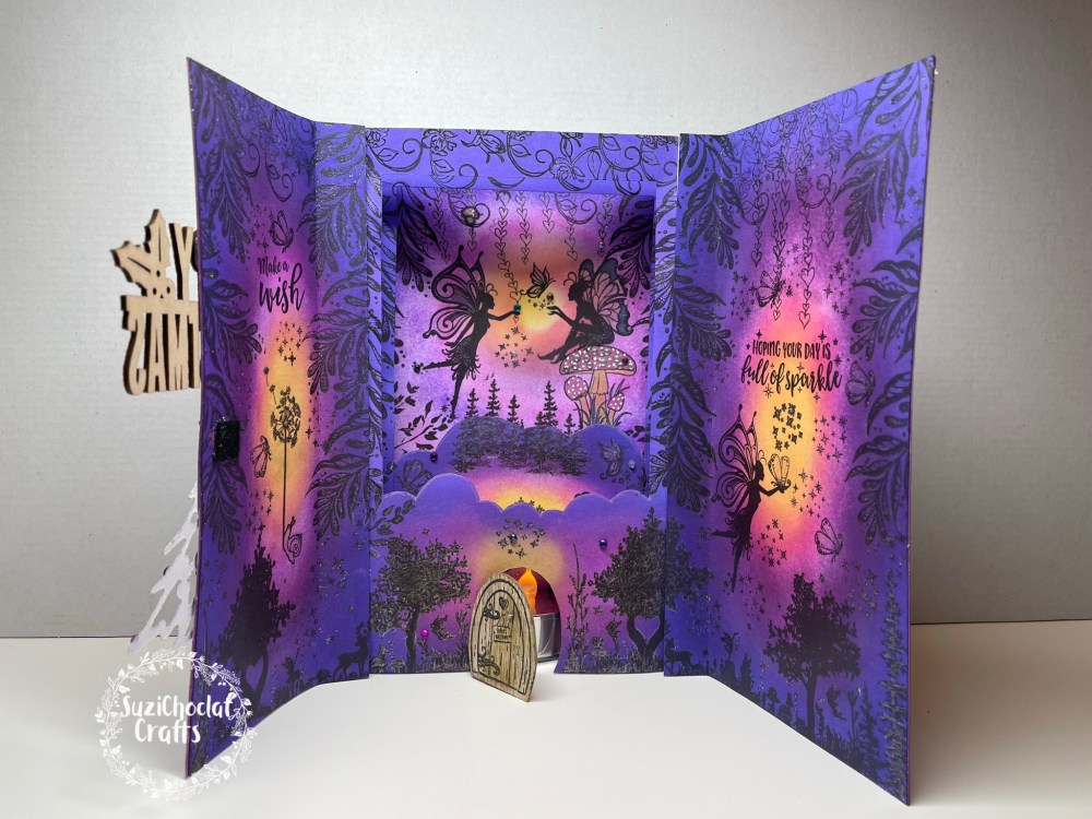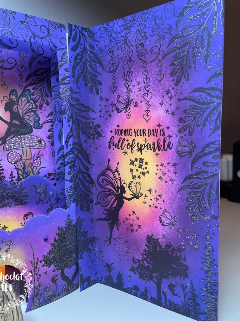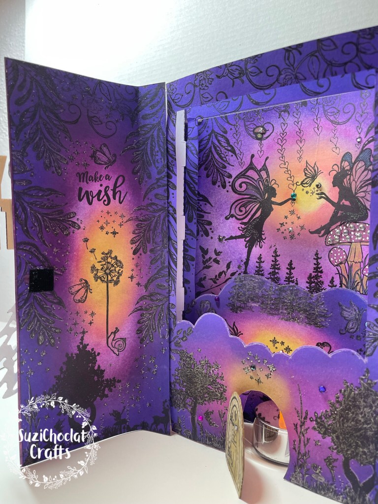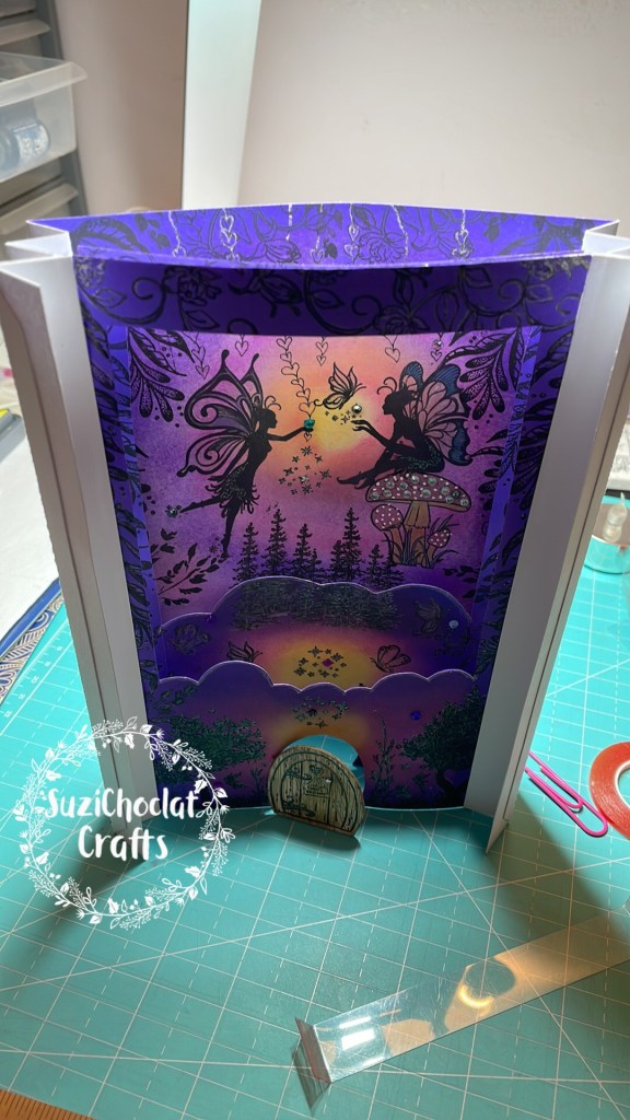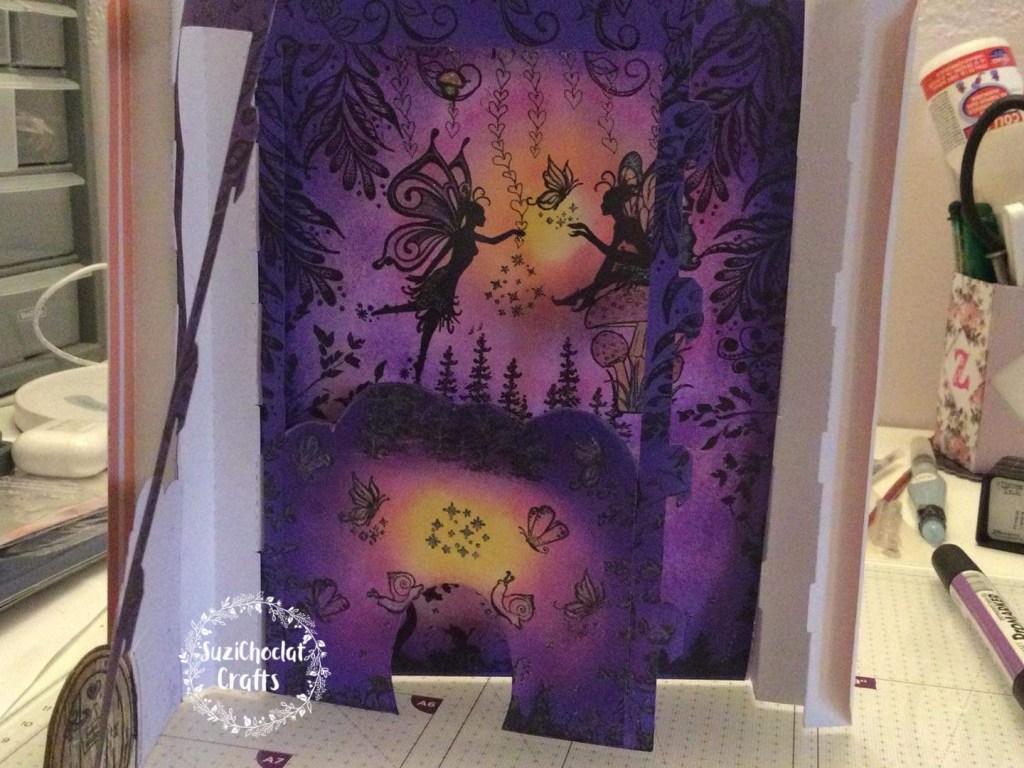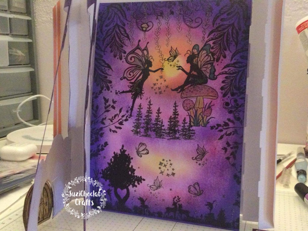 I started with white card and let my mind run riot with this design. All the beautiful colours inside this concertina layered shadow box book card are inked by hand. The three fairy scenes were created as I went along and stamped by hand.