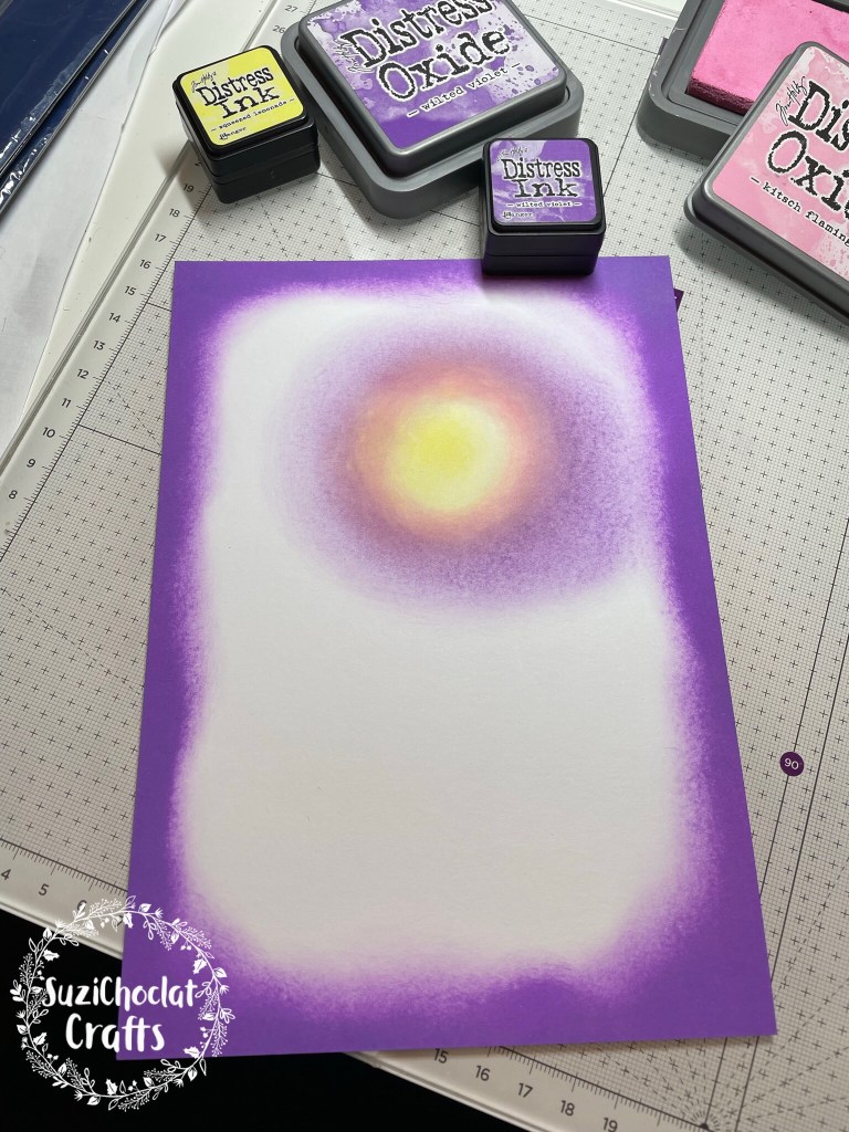 I cut a tunnel through the second slightly higher cloud topped layer and pushed a battery tea light inside to illuminate the natural glow created with the yellow, pink and purple distress inks.
