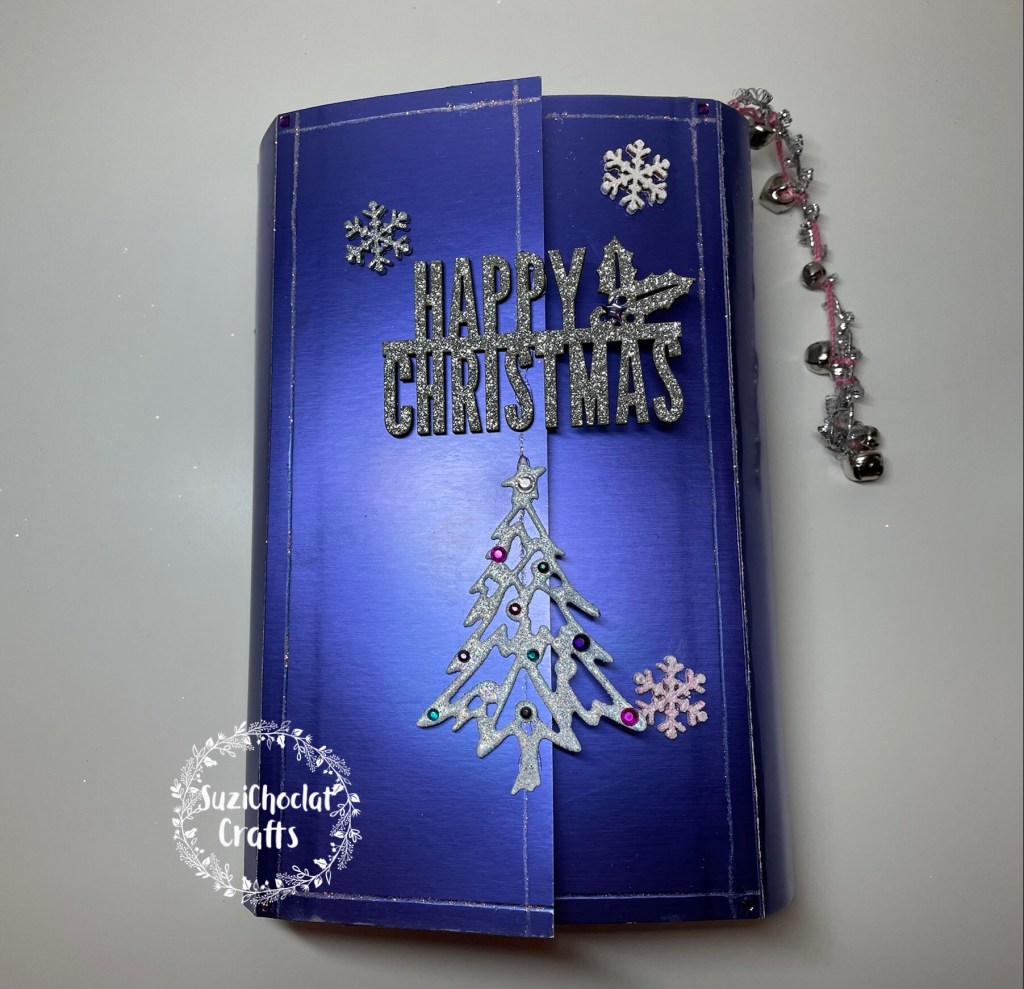 I then covered the outside of the card box with purple Mirri card. The edges had been embossed with some straight lines and glittered, a wooden Christmas sentiment and snowflakes were added to the gatefold front. A die cut Christmas tree was heat embossed with chunky embossing powder and coloured gems added to look like twinkly lights.