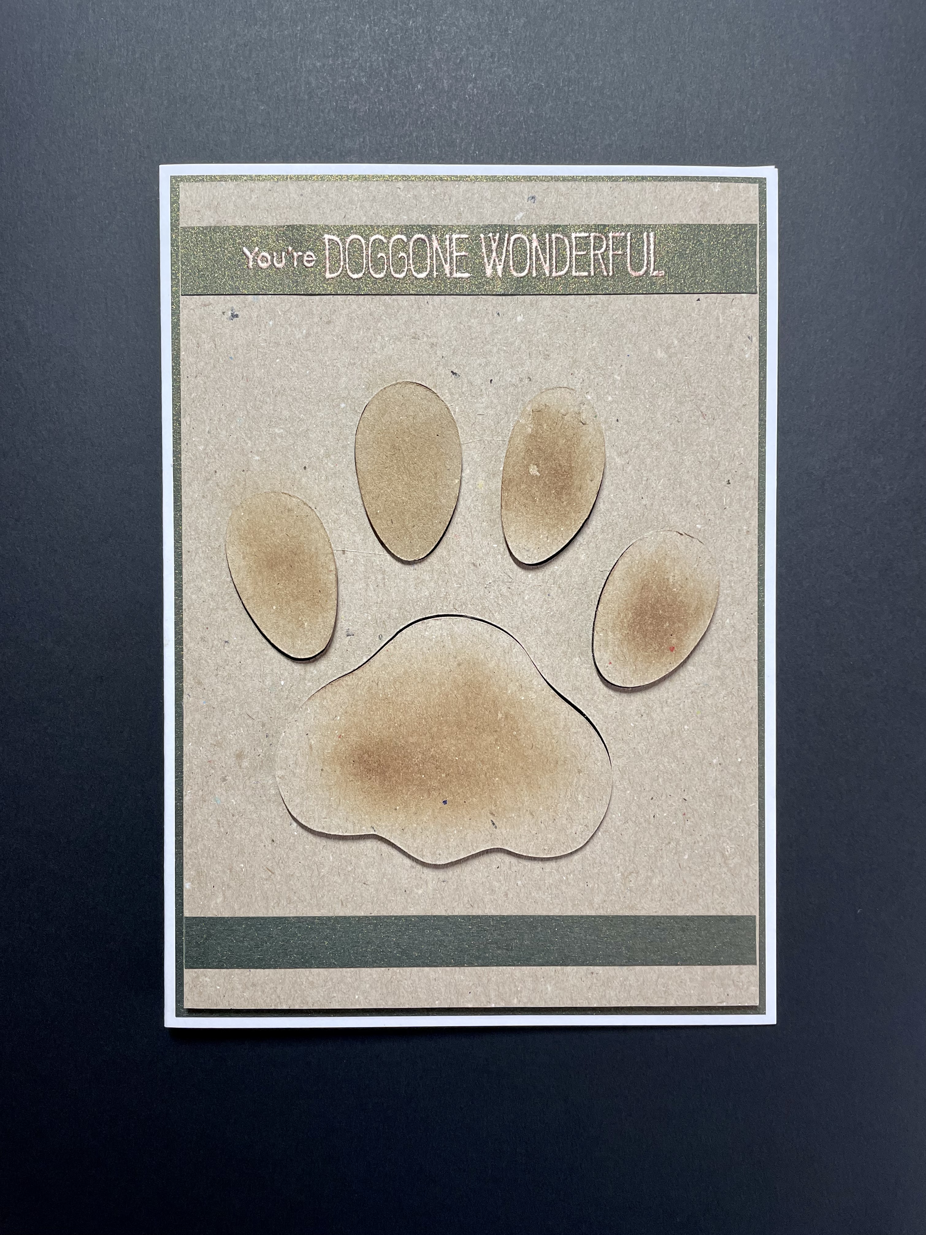 Measuring 5″ x 7″ this dog paw card has a white card base, black layer and brown recycled Kraft card topper. The dog paw is cut out of the Kraft card and placed back on 3D foam to make it stand up above the rest of the card front.